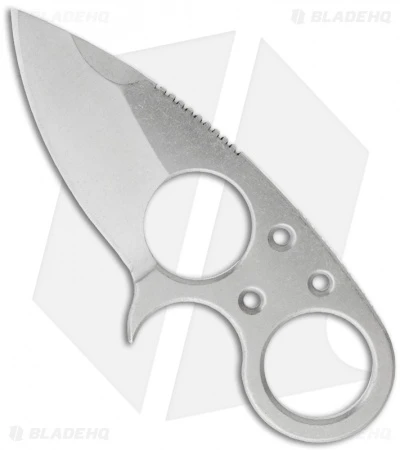 The J. Brous Silent Soldier V2 knife features a drop point style blade. The stonewash finished D2 tool steel has a double hole design with a middle finger groove and built in finger guard thumb for superior grip. This is a superb design for neck carry and includes a formed Kydex sheath and ball chain.
