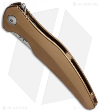 This model has a brown anodized aluminum handle and satin finished D2 tool steel blade.
