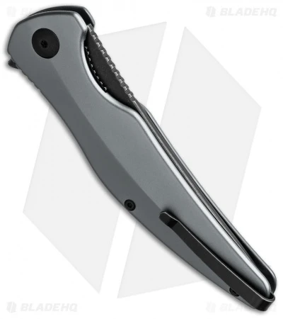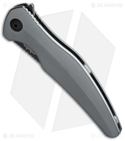 This model has a gray anodized aluminum handle and acid stonewashed D2 tool steel blade.