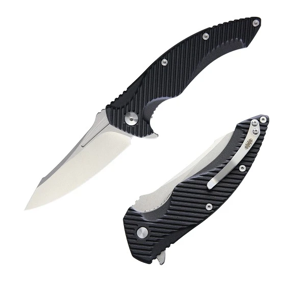 A collaboration Design by Jason Brous and Jason Moriel-Riboloff from Tanium Design, The T4 was created to fulfill a multi-use category such as a fighter, every day carry or survival knife. The D2 blade is a multi-purpose hollow ground modified drop point and makes re-sharpening effortless. The T4 utilizes an integrated flipper for quick blade deployment on a ball bearing pivot system as well as an elegant recessed finger groove on each side for easy and comfortable thumb opening. The handle scales and backspacer are made from contoured polymer.