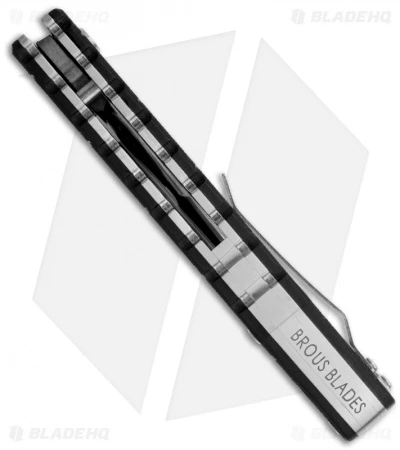 The Brous Blades Triple Threat Folder features a unique triple-bevel grind. The D2 tool steel blade is 3.5″ in length and features a stonewash finish. The blade is not only visually stunning, but has serious cutting power. The handle has black G10 scales with the signature Brous maze pattern for a strong and secure grip. There are heavy grooves that run across the spine of the entire 8″ knife in the open position, this allows for an ultimate grip and rock solid control. The handle has stainless steel liners, a stainless steel back spacer and dual thumb stud. Each knife comes with 2 pocket clips, one for each side of the knife. Also includes certificate of authenticity and polishing cloth.