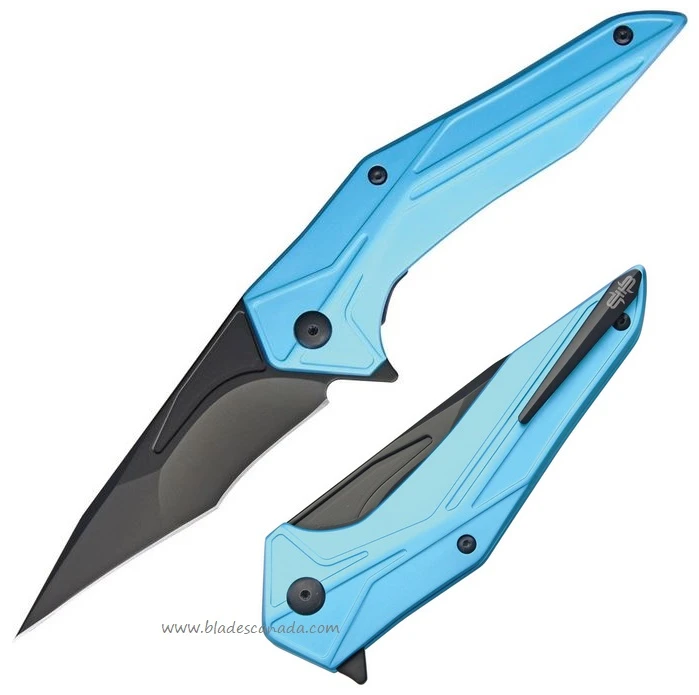 5.5″ closed. 4.13″ Blackout finish D2 tool steel blade. Blue aluminum handle. Extended tang. Pocket clip. Linerlock. Storage case.